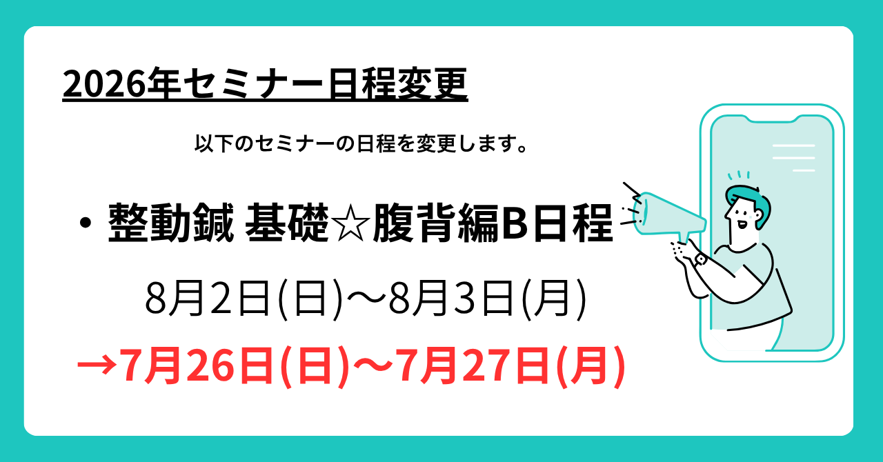 2026年8月2日(日)〜3(月)に開催を予定していた「整動鍼 基礎☆腹背編 B日程」を、7月26日(日)〜27日(月)に変更いたします。